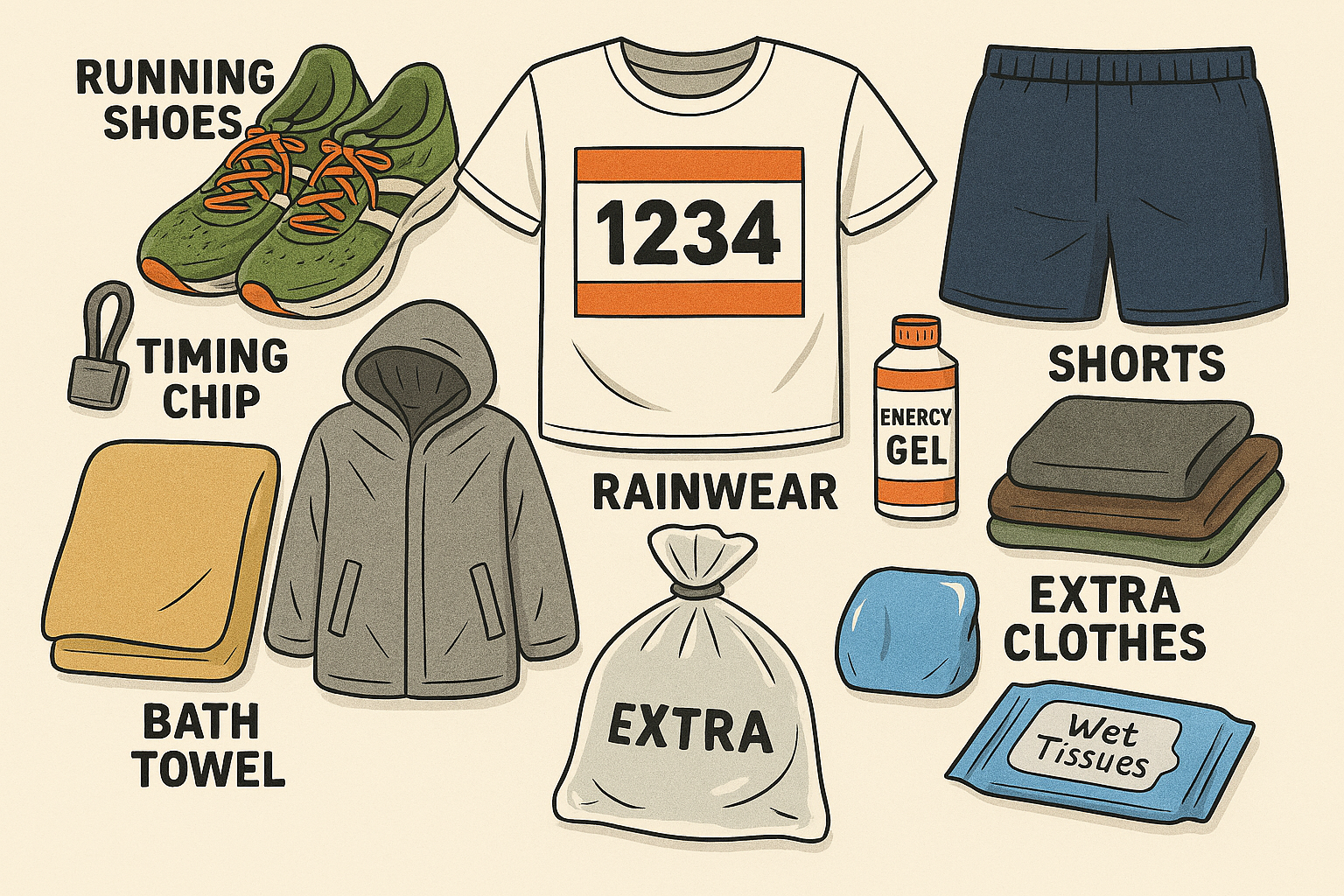 大会当日に忘れ物がないよう、事前に持ち物リストを作成して確認することをおすすめします。ランニングシューズやウェアはもちろん、ナンバーカード(ゼッケン)と計測チップは絶対に忘れてはいけません。その他、天候に応じた雨具や防寒着、エネルギー補給食、着替えなども準備しておくと安心です。