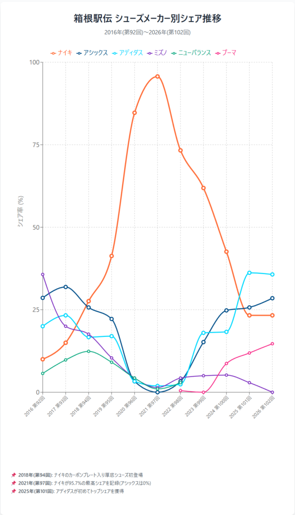 これ以降、2021年ではナイキのシューズが箱根駅伝での着用率96%に迫るなど、驚異的なシェア獲得した一方で、このようなスーパーシューズを開発できていなかった、かつての箱根駅伝でシェア争いをしていたミズノやアシックスは着用率が低下する一方でした。
